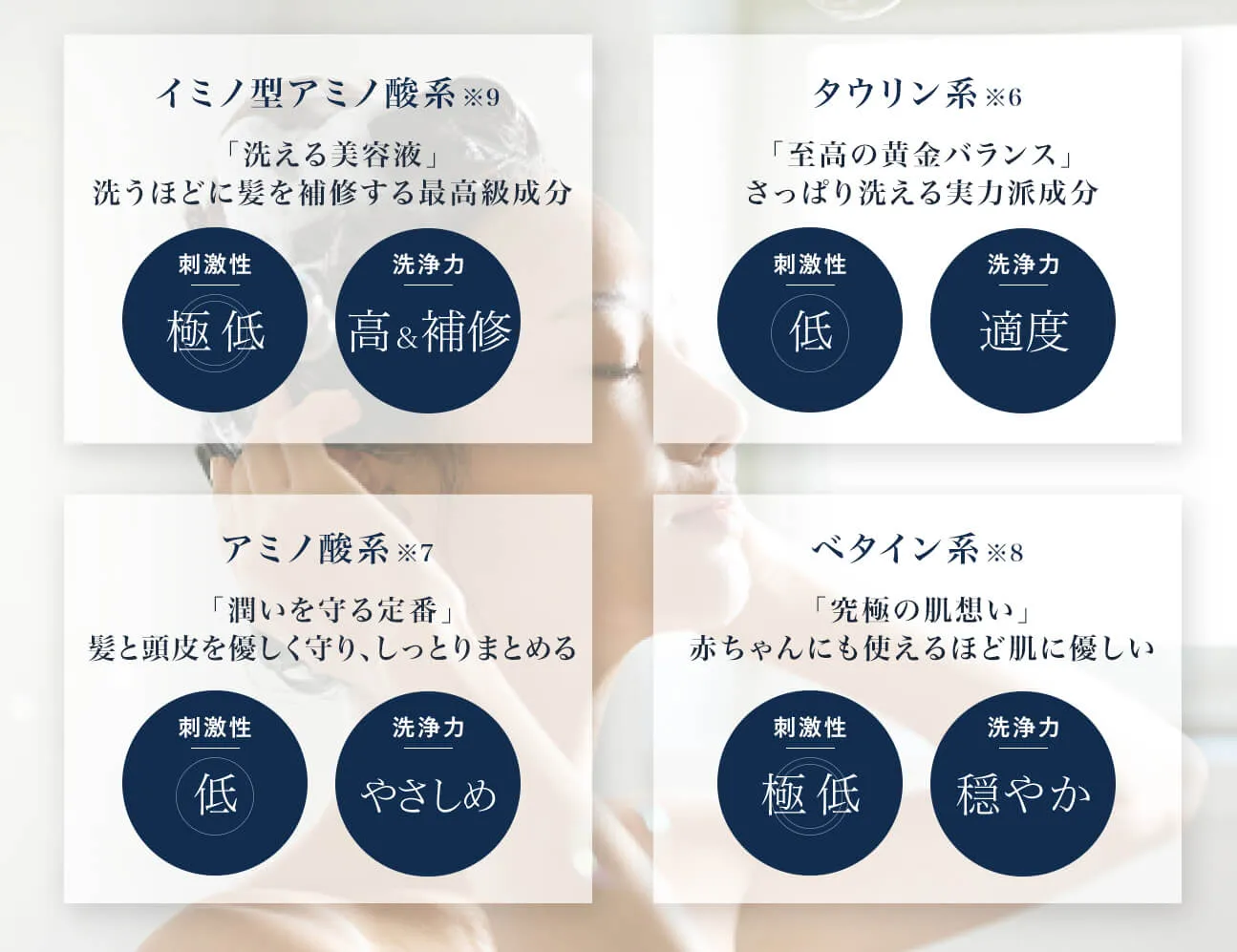 洗浄成分はタウリン系※6 、アミノ酸系※7 、ベタイン系※8 、補修のイミノ型アミノ酸系※9 等のミックス。 ダメージにさらされた髪を、低刺激、細やかな泡でやさしく洗い上げます。