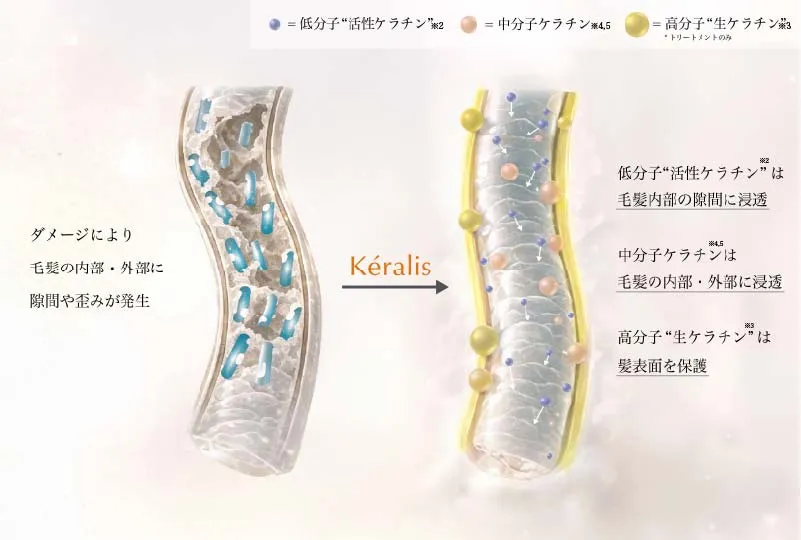 『Kéralis(ケラリス)』は、髪の約90%を占めるKera(=ケラチン)と、仏語で“なめらか・まっすぐ”を意味する「lisse」(リス)を併せ、「Kera+lisse」“髪の内側から美を再構築する”という意味が込められています。